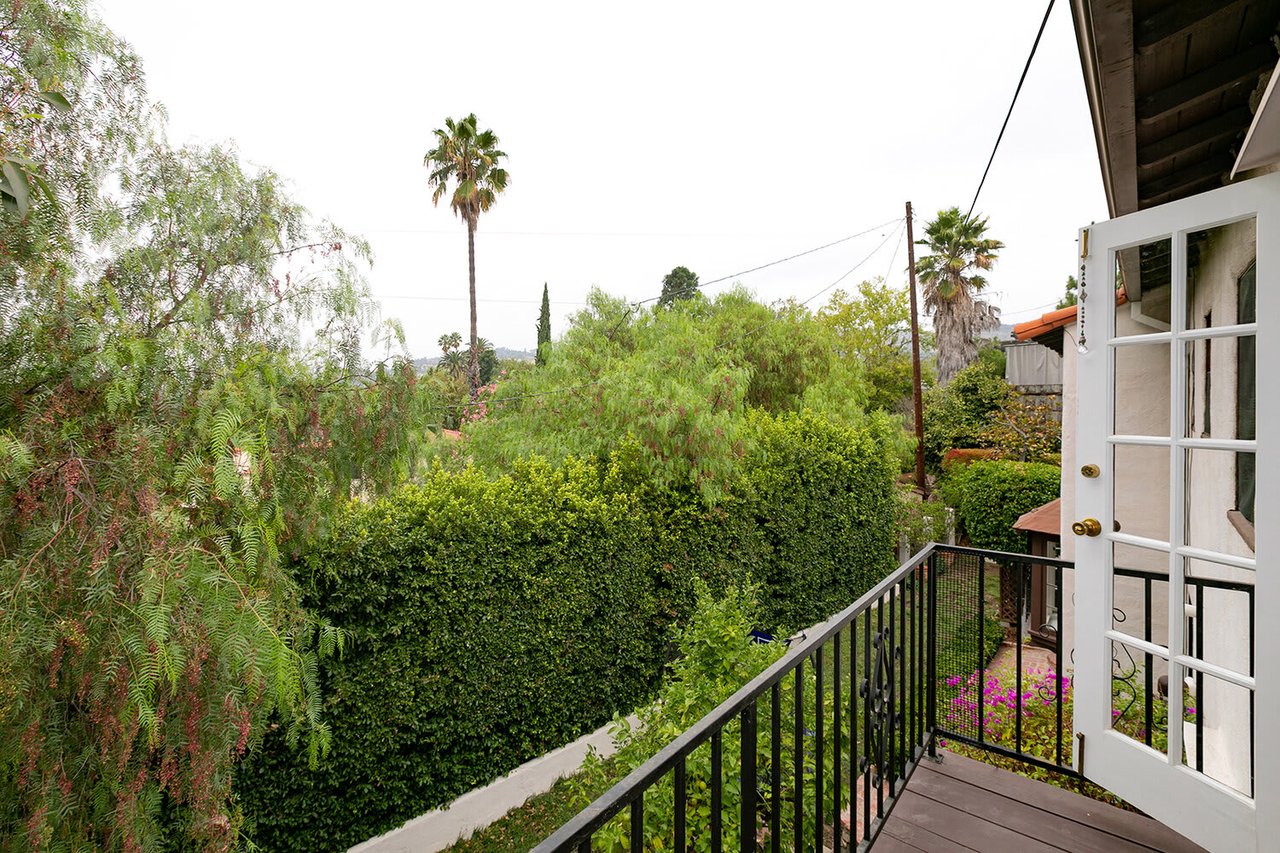 Romantic vintage detailing abounds throughout the home - from the vaulted and beamed living room to the Mexican Talavera tiling. Entering through the gated courtyard sitting area, the main level is comprised of a living room with built-ins and fireplace plus lovely new gourmet kitchen, dining area, casual eat-in island, plus lots of storage. Off the kitchen is the large dining patio and deck, plus detached garage. The main level also hosts the primary suite with new bath and wraparound balcony with views of the Observatory, plus an additional bedroom and bathroom. The lower level features office/den and third bedroom and bathroom perfect for work from home or as private guest quarters. Off the lower level is an outdoor patio with herb garden, shady play area and grassy yard. A lovely updated home for everyone, moments to the trailheads of Griffith Park and hot spots in Los Feliz Village.